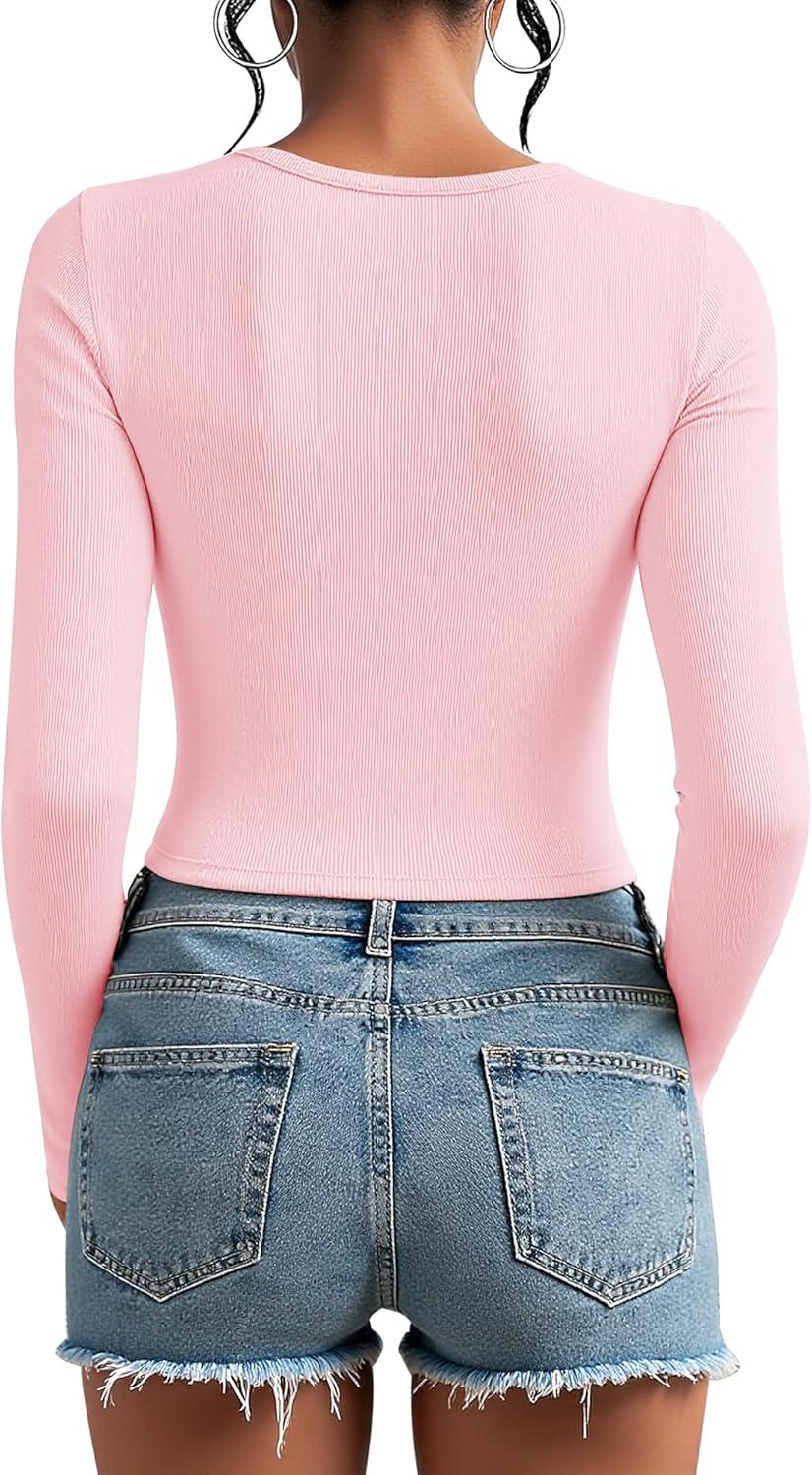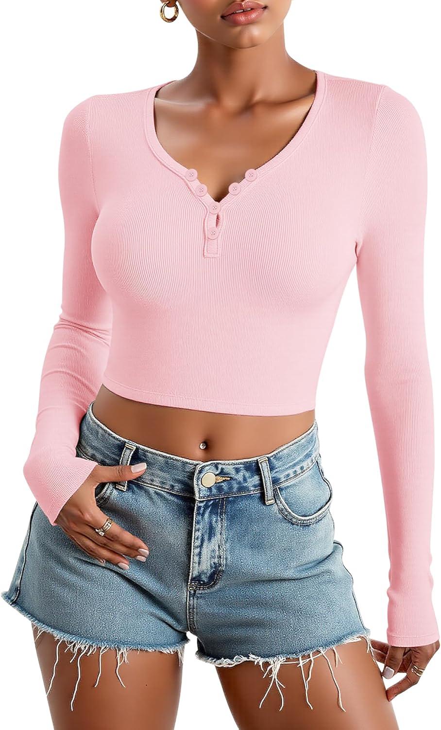 Stelle Cropped Henley Shirts for Women Long Sleeve V-Neck Shirt Ribbed Tops Knit Button Slim Fitted Blouse(Cherry Blossom)