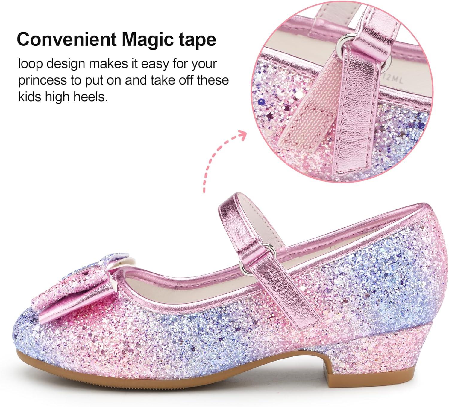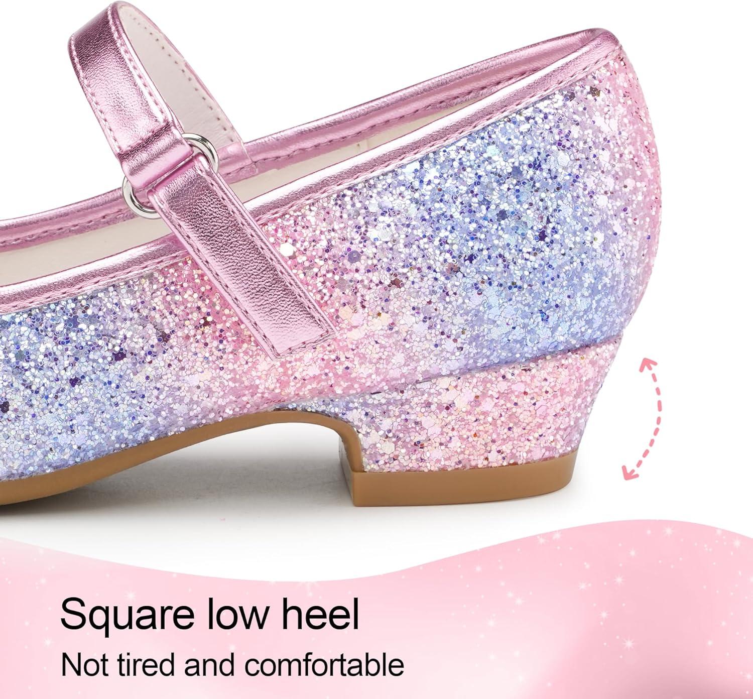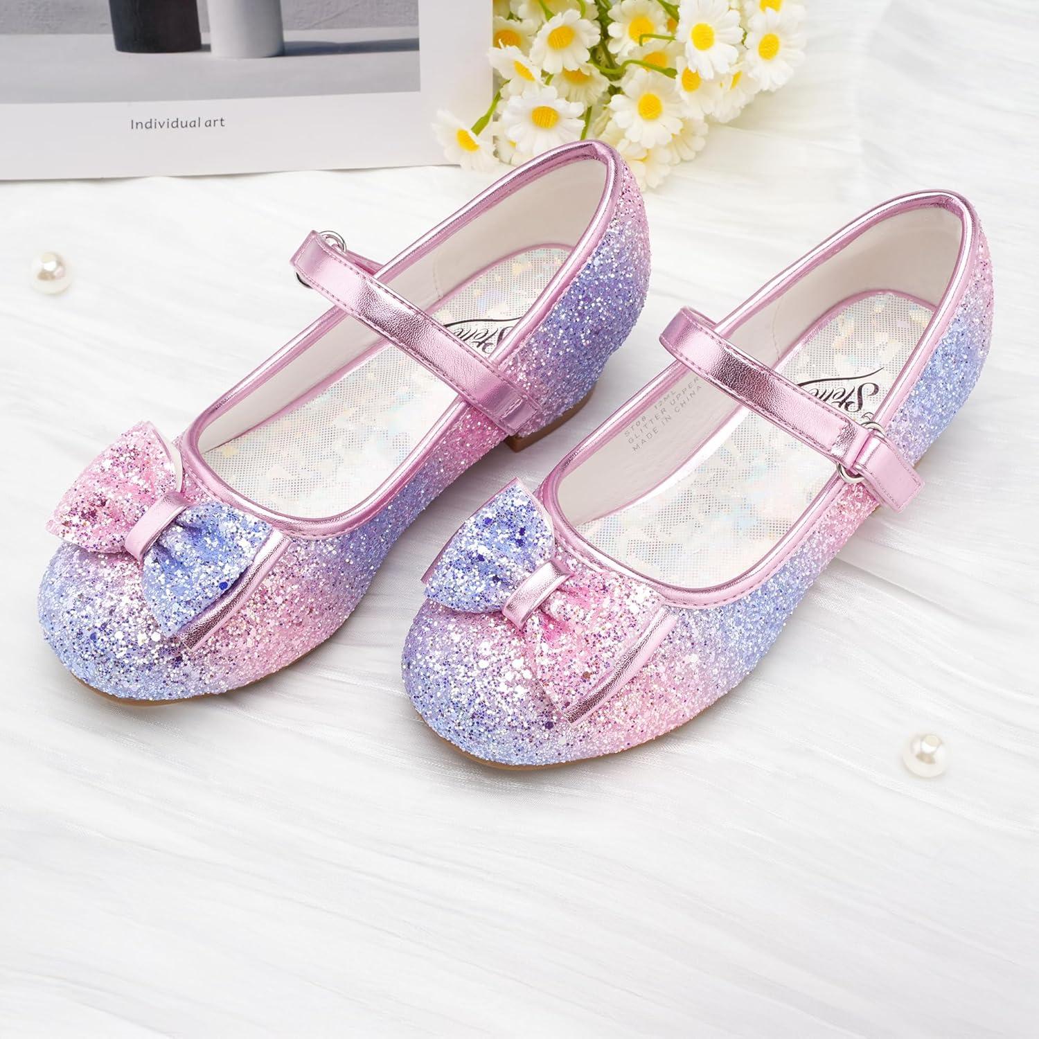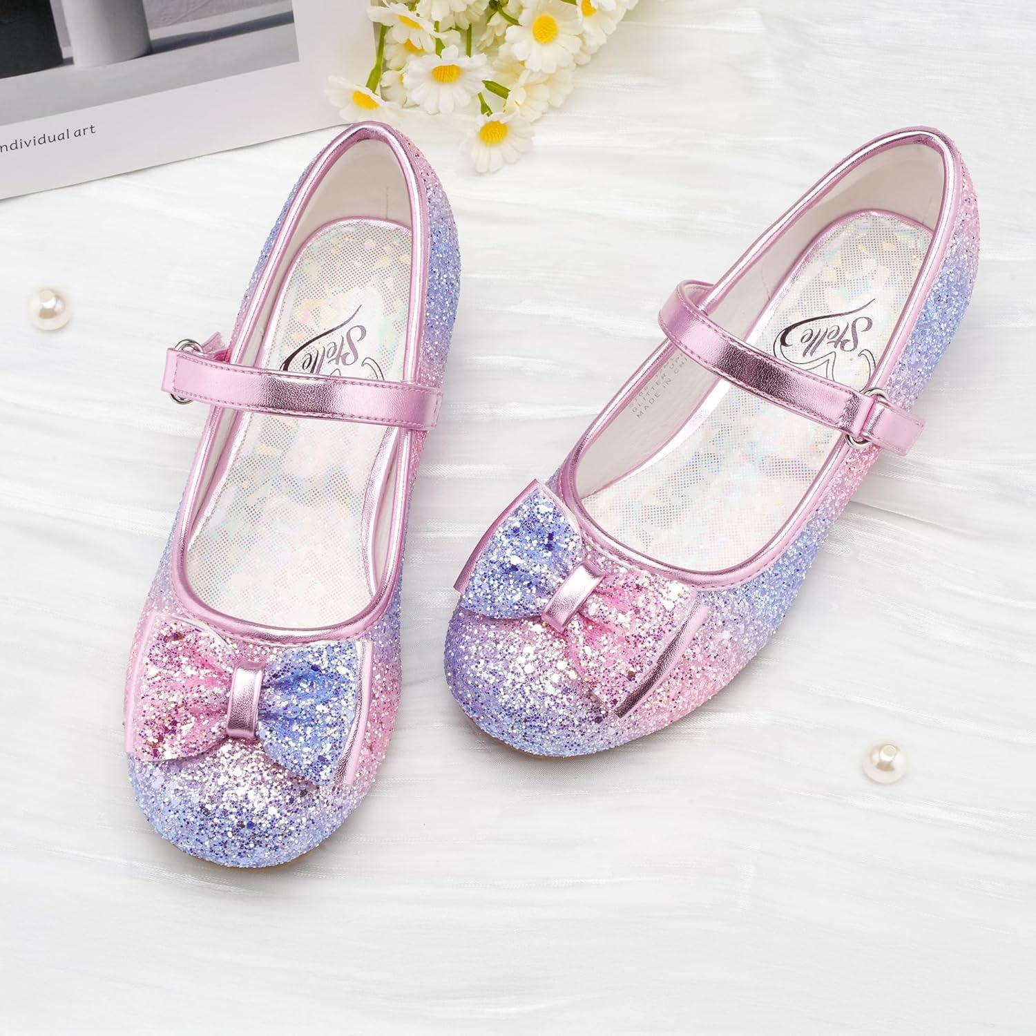 Stelle Girls Dress Shoes Glitter Princess Shoe Flower Mary Jane Low Heels Party Wedding Prom Footwear for Toddler Kids(T08-rainbow Blue)