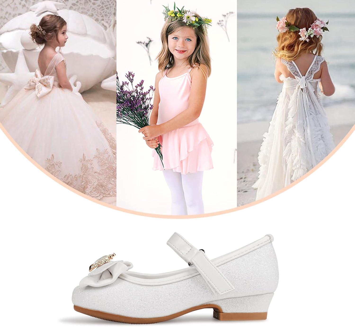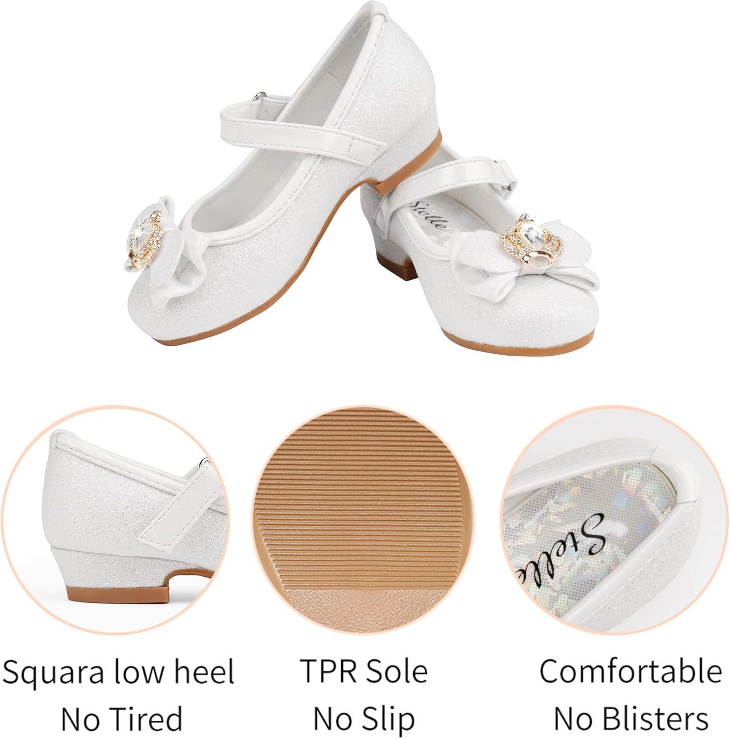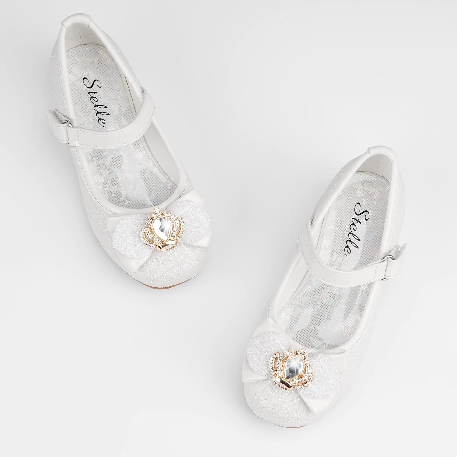 Stelle Girls Dress Shoes Glitter Princess Shoe Flower Mary Jane Low Heels Party Wedding Prom Footwear for Toddler Kids(T13-white Glitter)