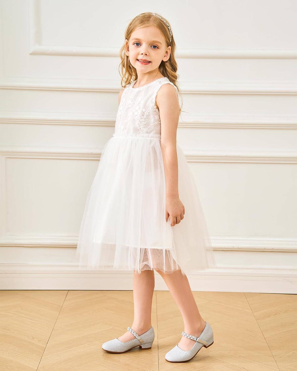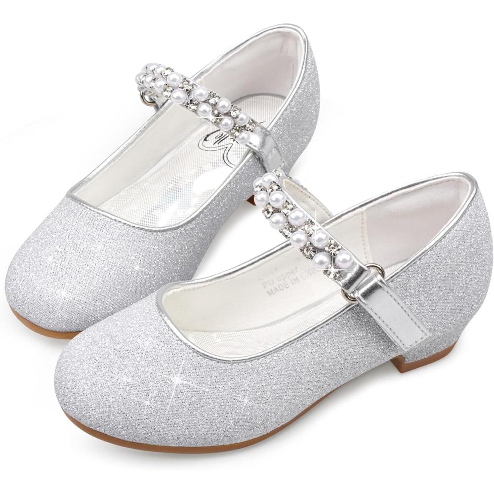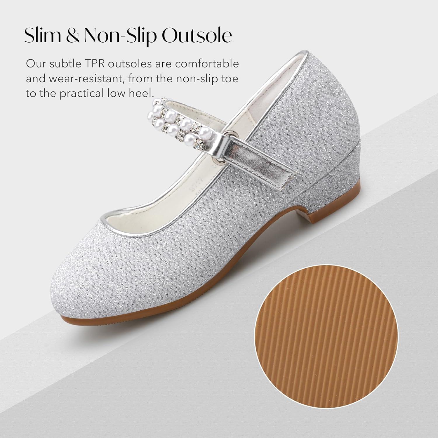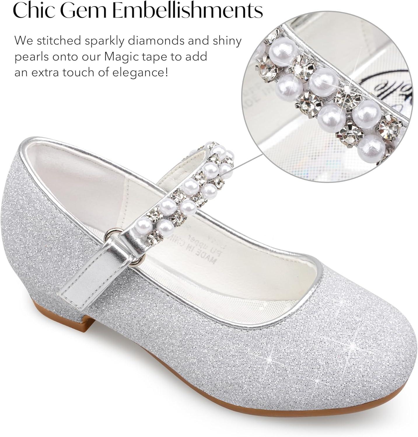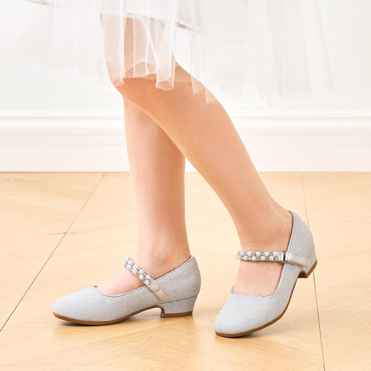 Stelle Girls Dress Shoes White Flower Girl Shoe Mary Jane Low Heels for Wedding (Toddler/Little/Big Kid)(Silver(shiny Strap))