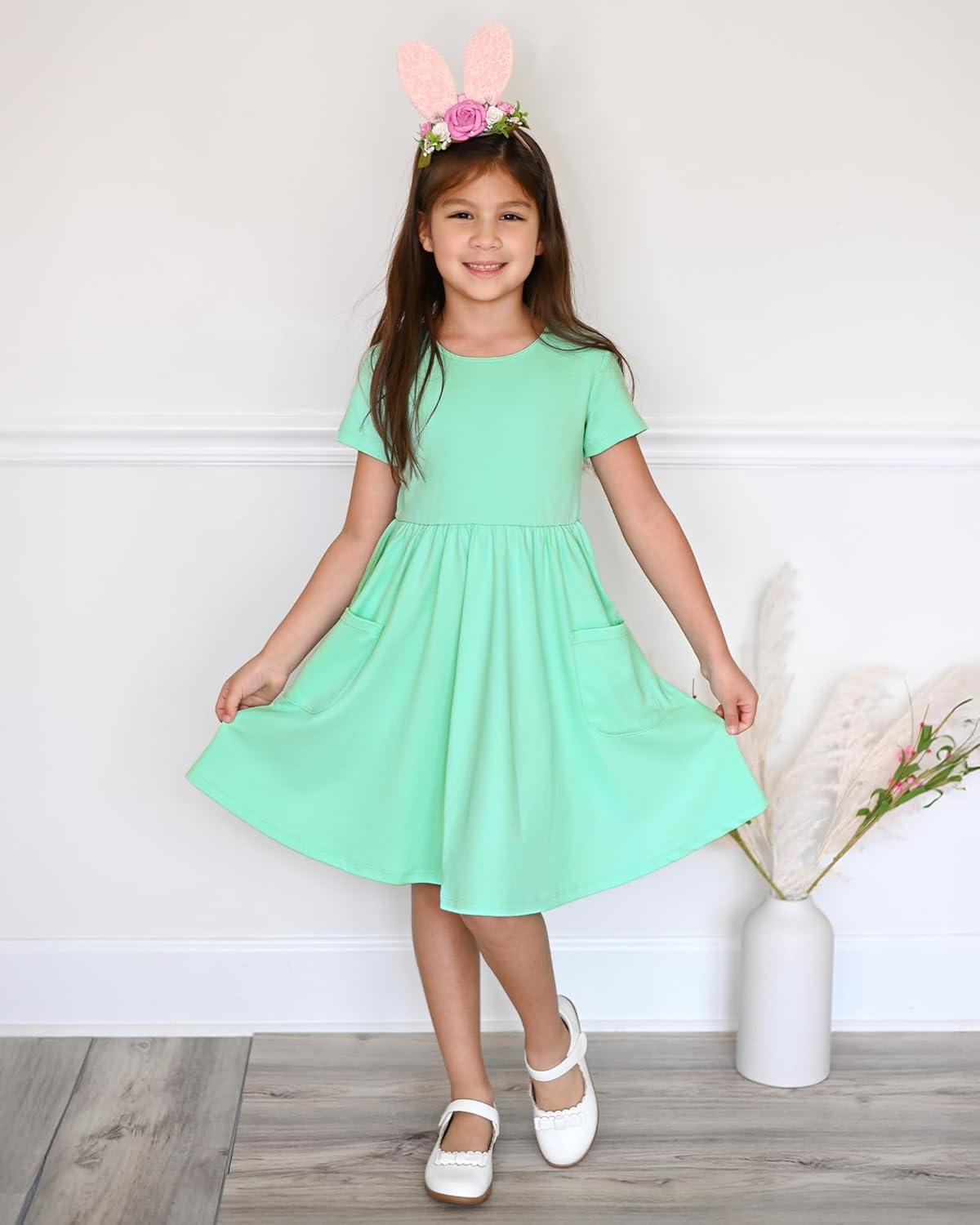 Stelle Girls Dresses Cotton Short Sleeve Dress Cute Midi Casual Sundress with 2 Pockets(Mint Green)