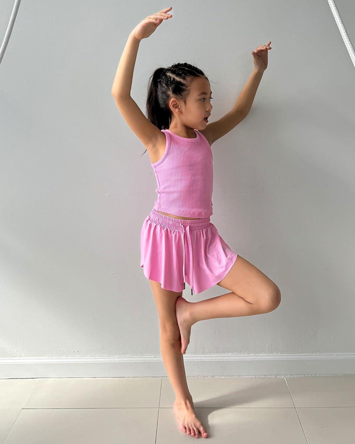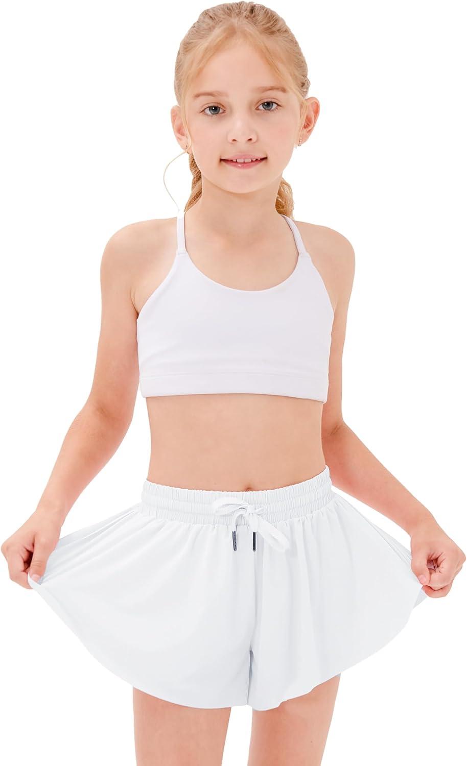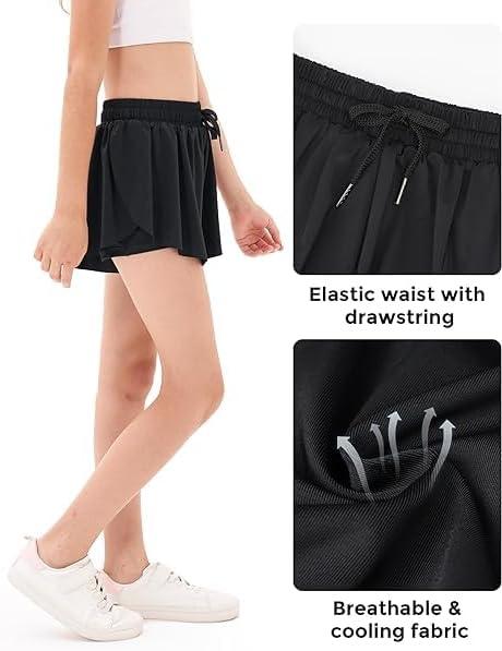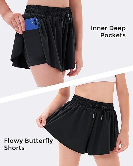 Stelle Girls Flowy Shorts with Pockets Athletic Running Skirt High Waist Butterfly 2 in 1 Sports Short 5-16 Years(Black+white+cotton Candy)