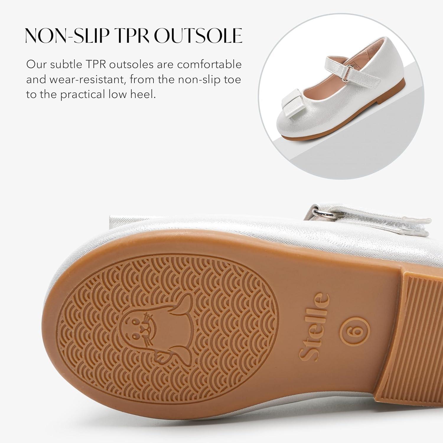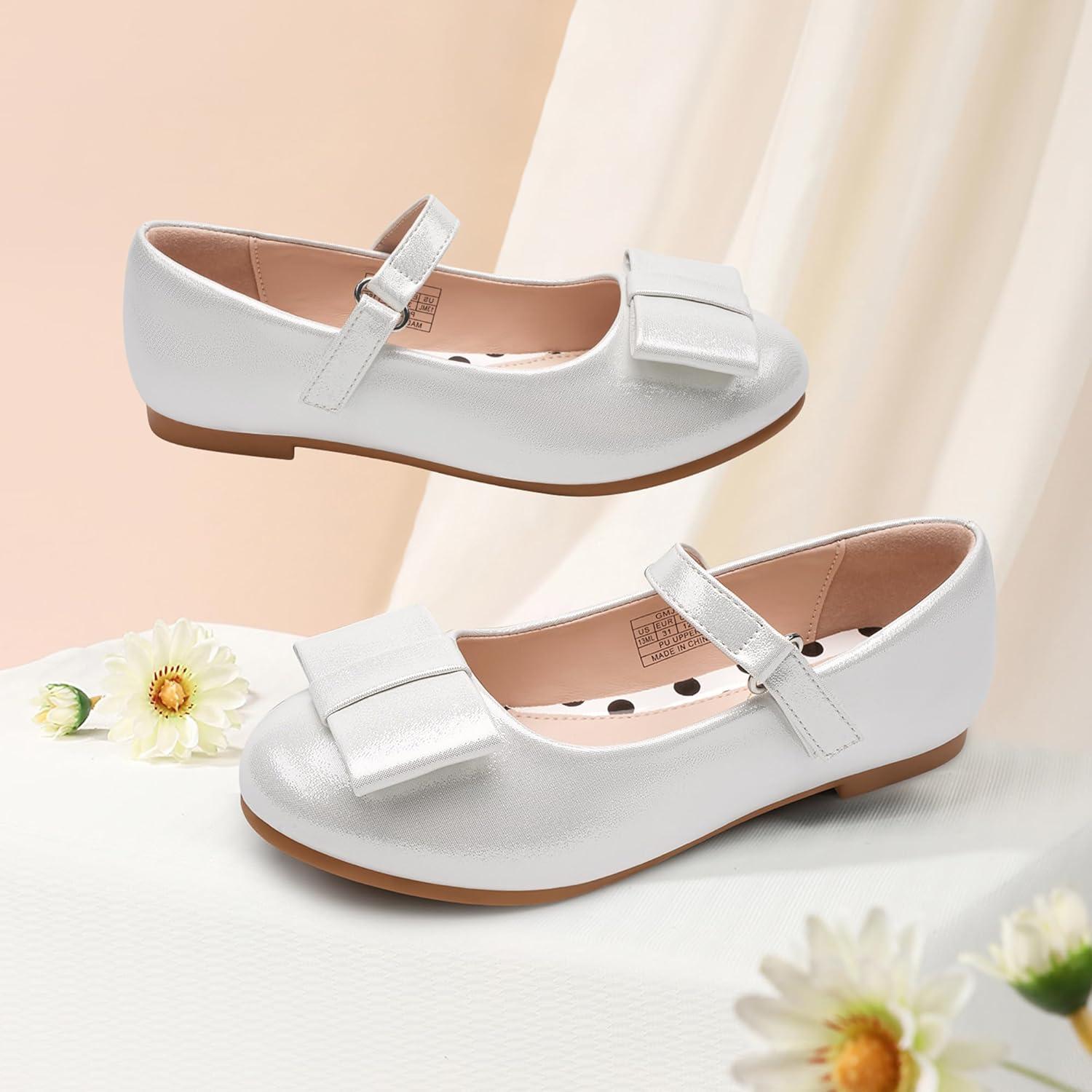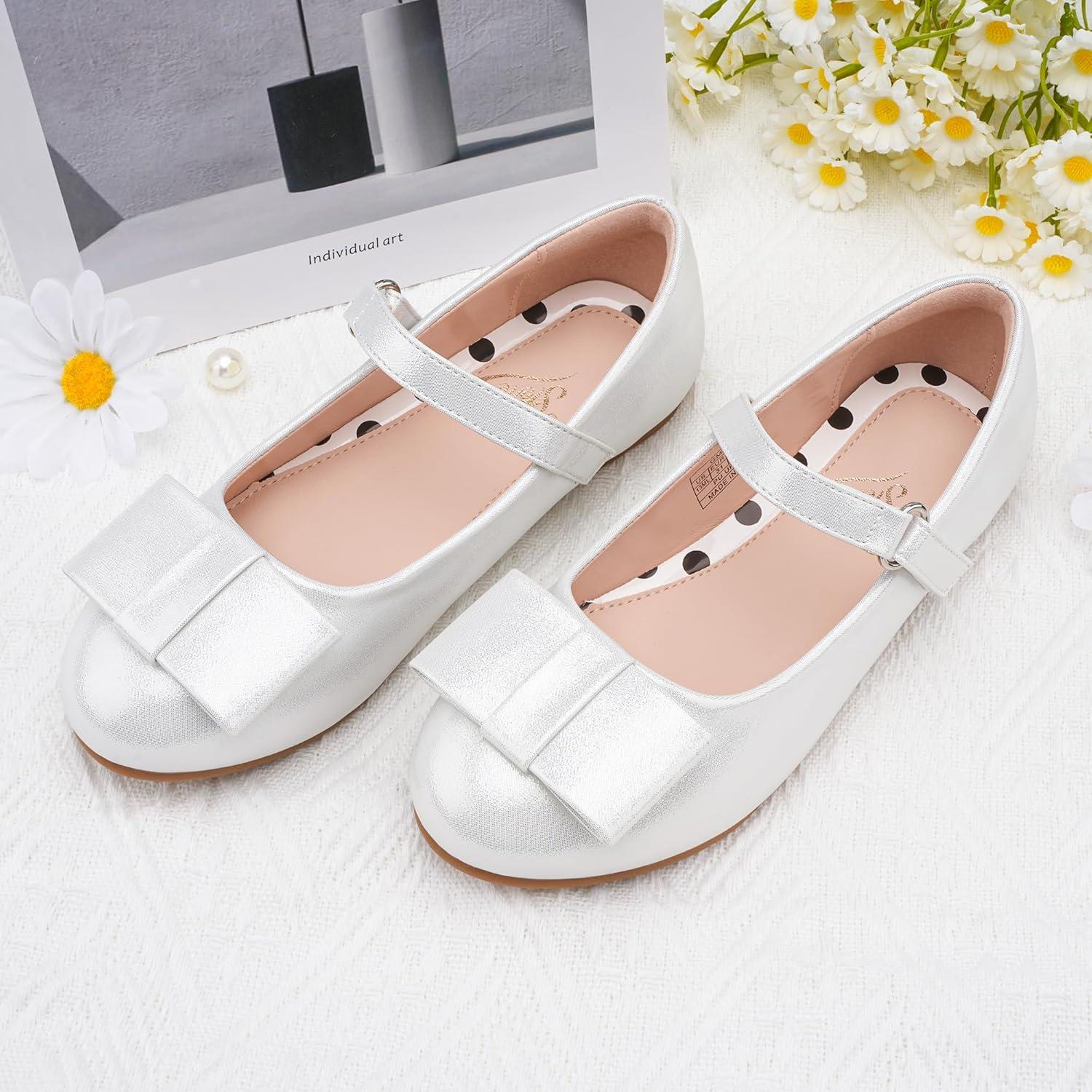 Stelle Girls Mary Jane Dress Shoes Ballerina Flat with Bow for Toddler/Little/Big Kids(Light Siliver)