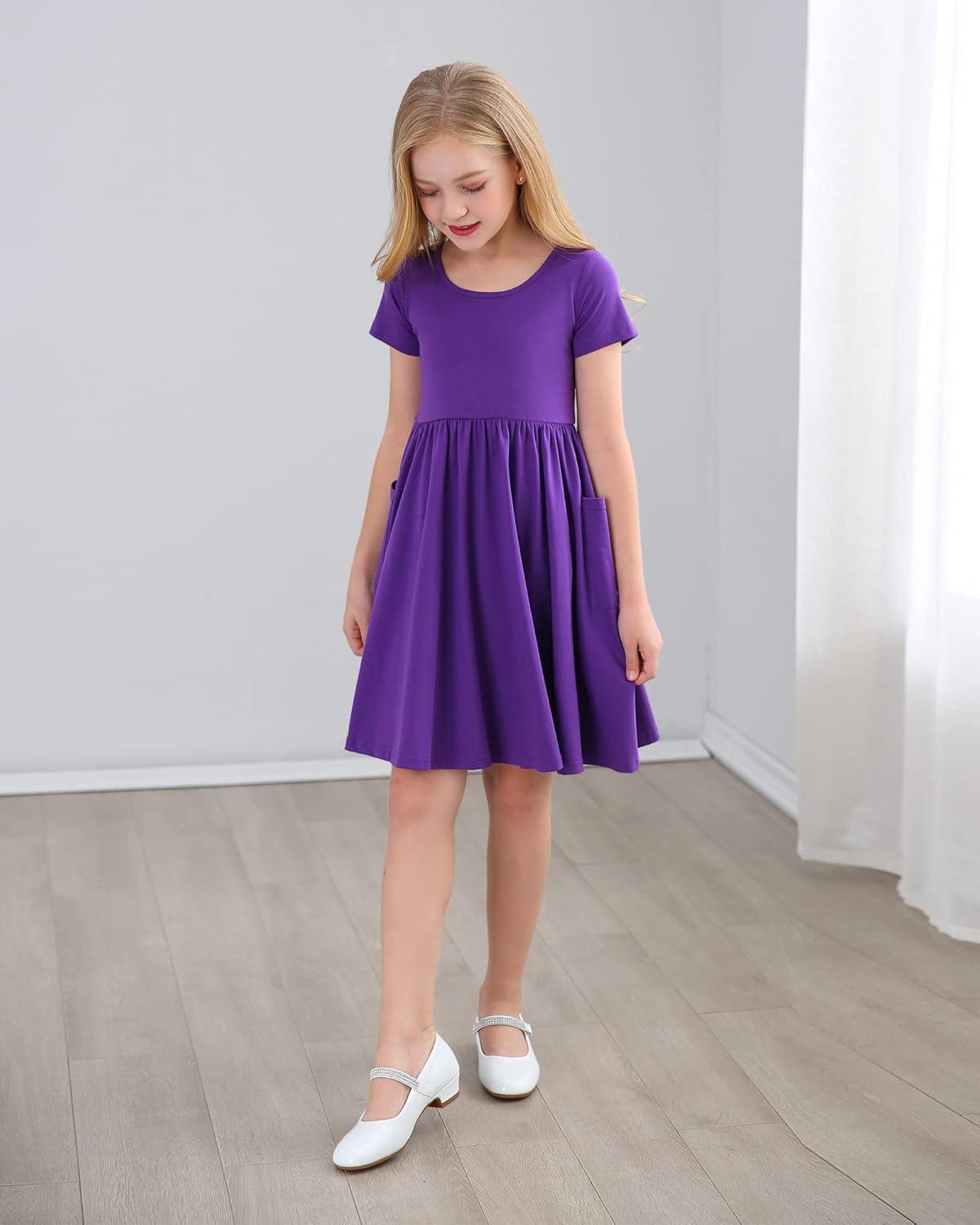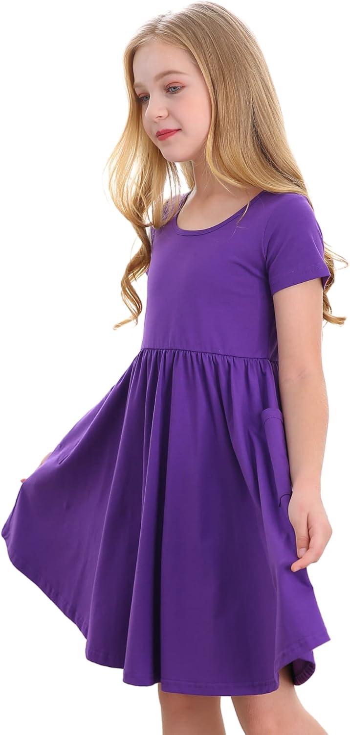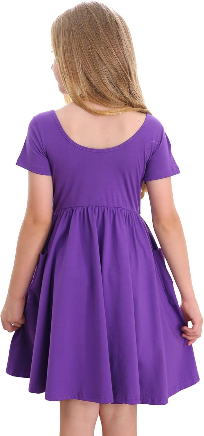 Stelle Girls Short Sleeve Dress Summer Kids Toddler Skater Twirl A Line Solid Color T-Shirt Dress for School Casual 3-12 Y(A19-purple (With Pocket))