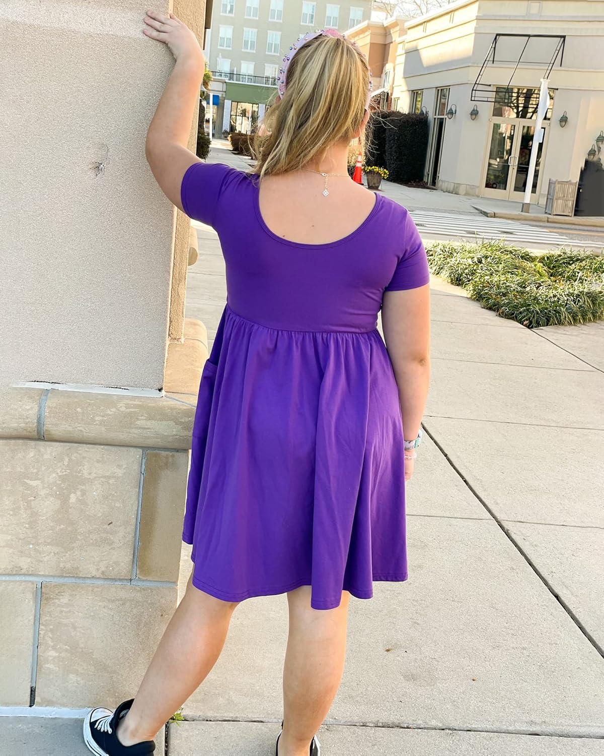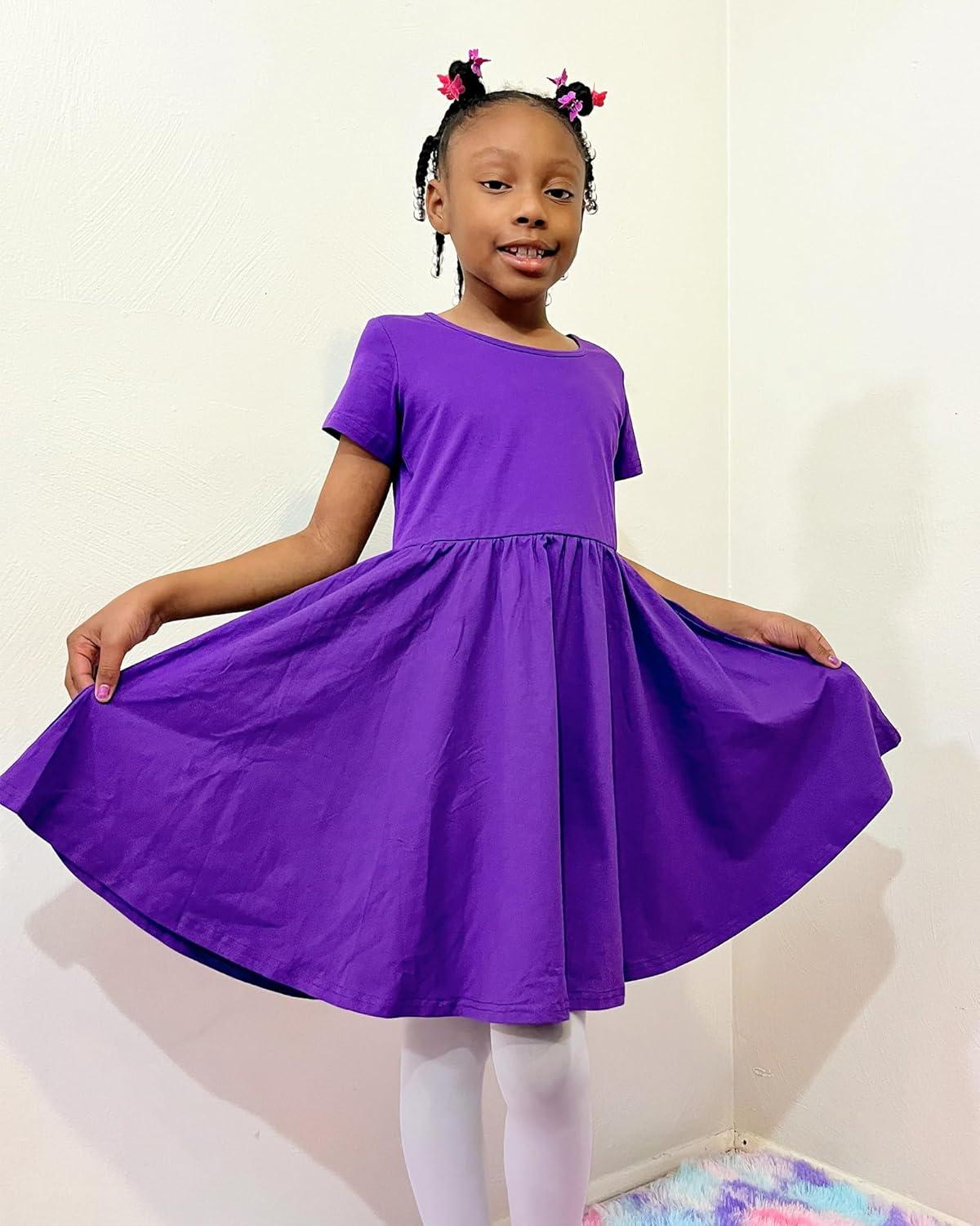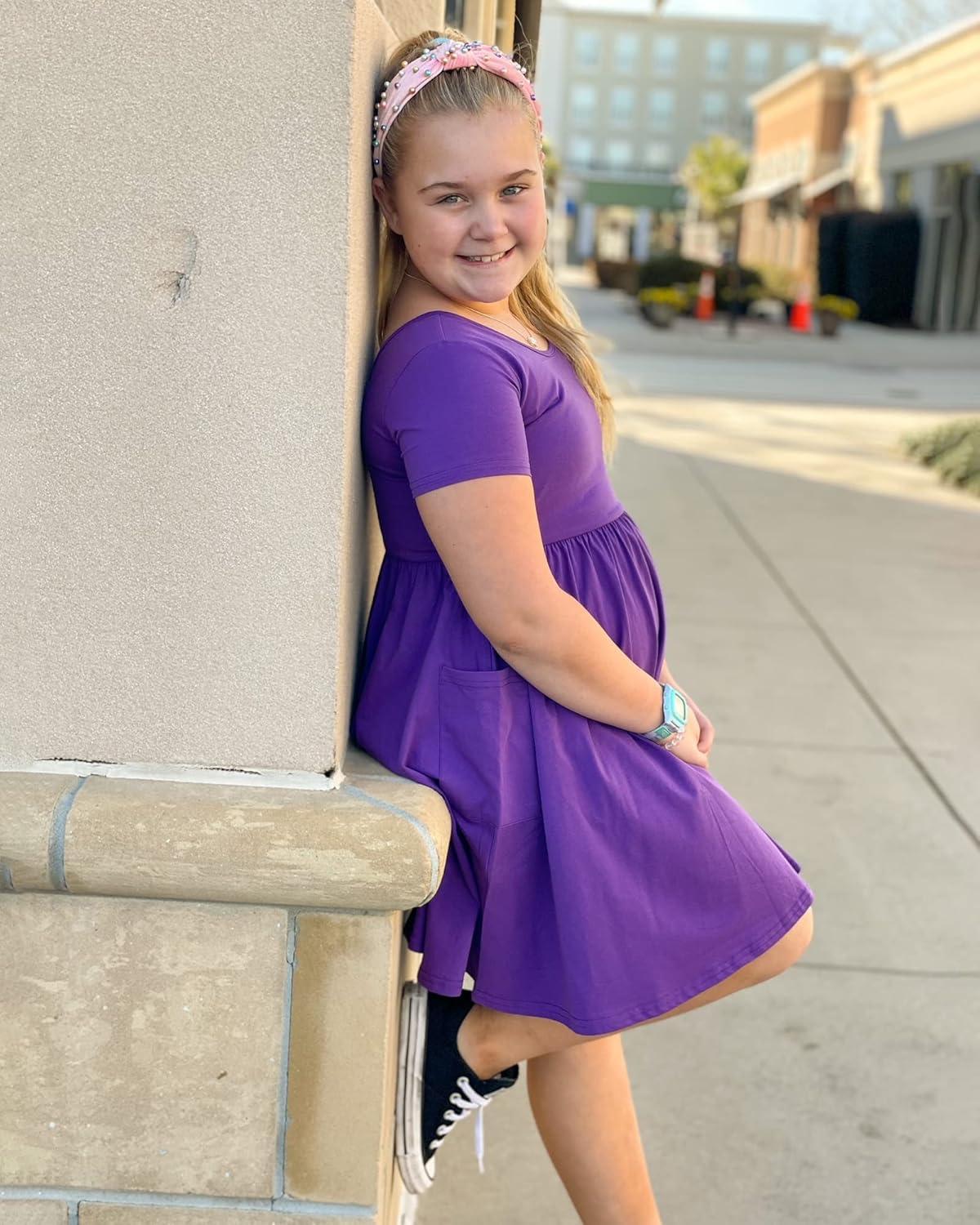 Stelle Girls Short Sleeve Dress Summer Kids Toddler Skater Twirl A Line Solid Color T-Shirt Dress for School Casual 3-12 Y(A19-purple (With Pocket))
