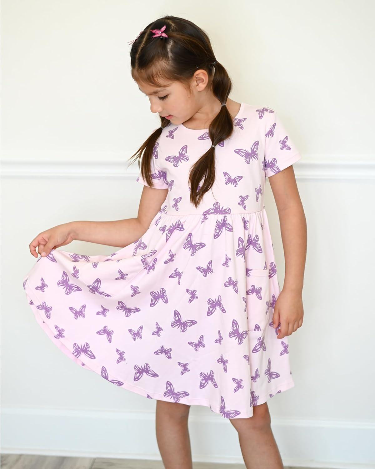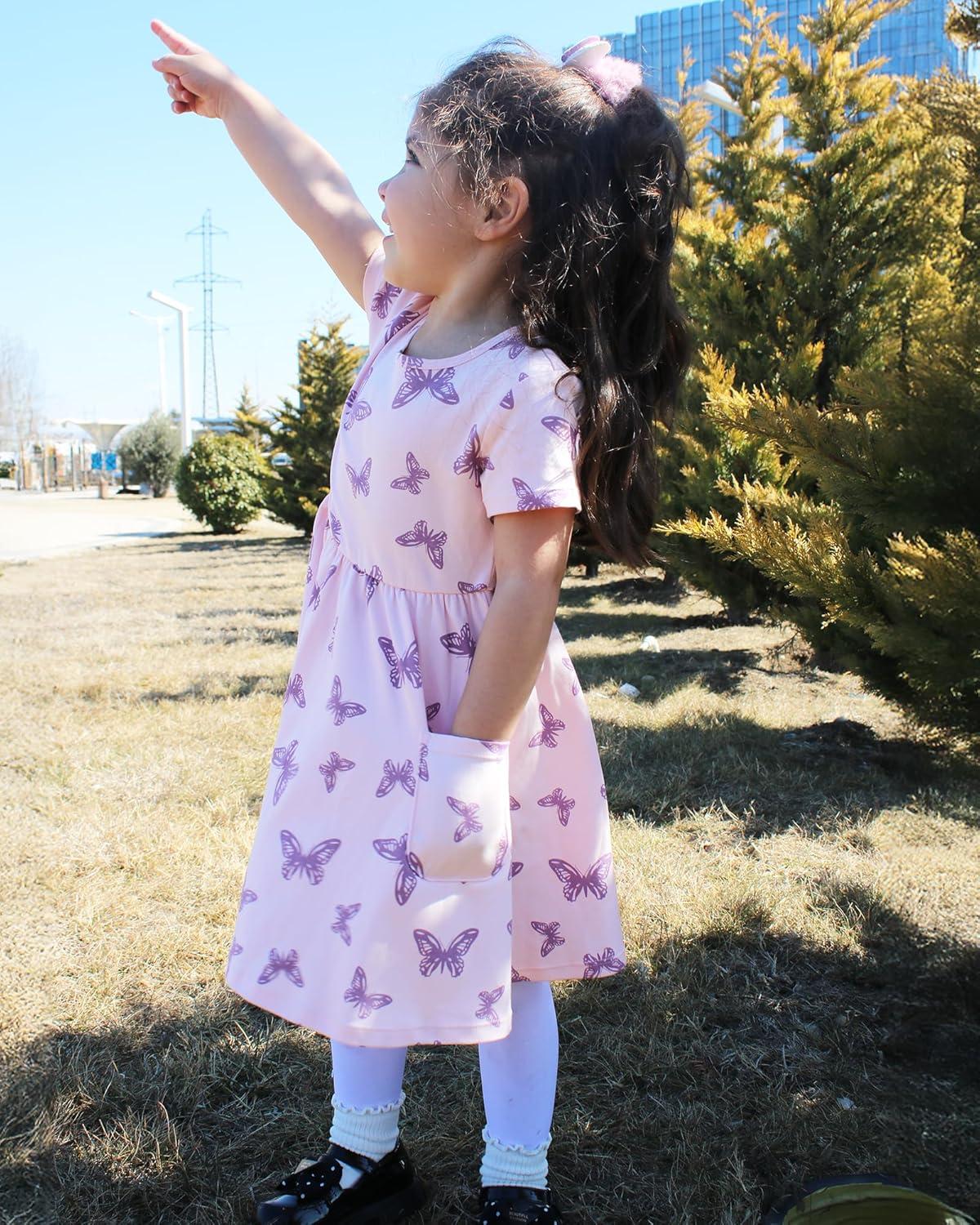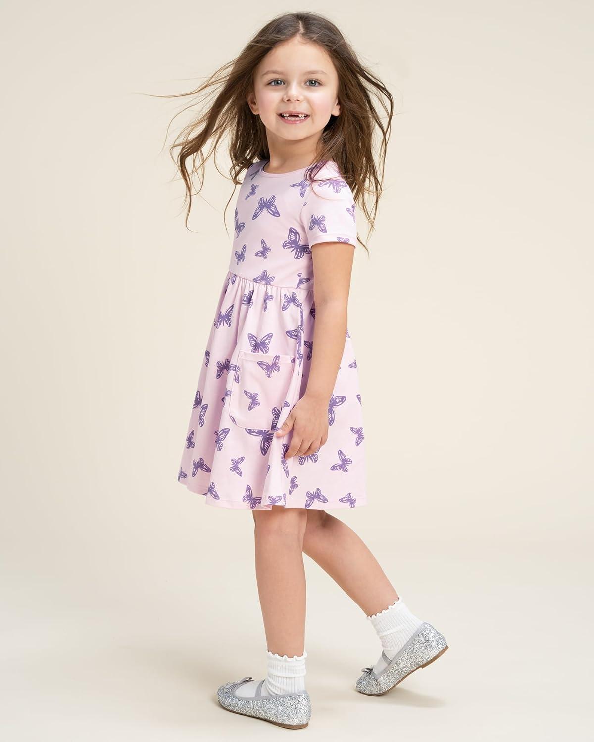 Stelle Girls Short Sleeve Dress Summer Kids Toddler Skater Twirl A Line Solid Color T-Shirt Dress for School Casual 3-12 Y(Butterfly Bliss Print)