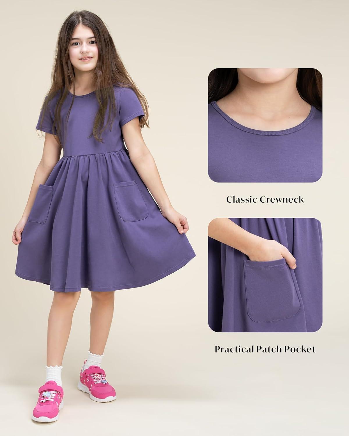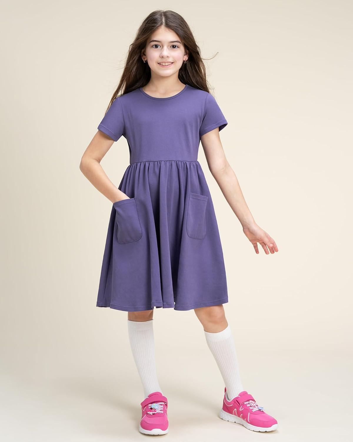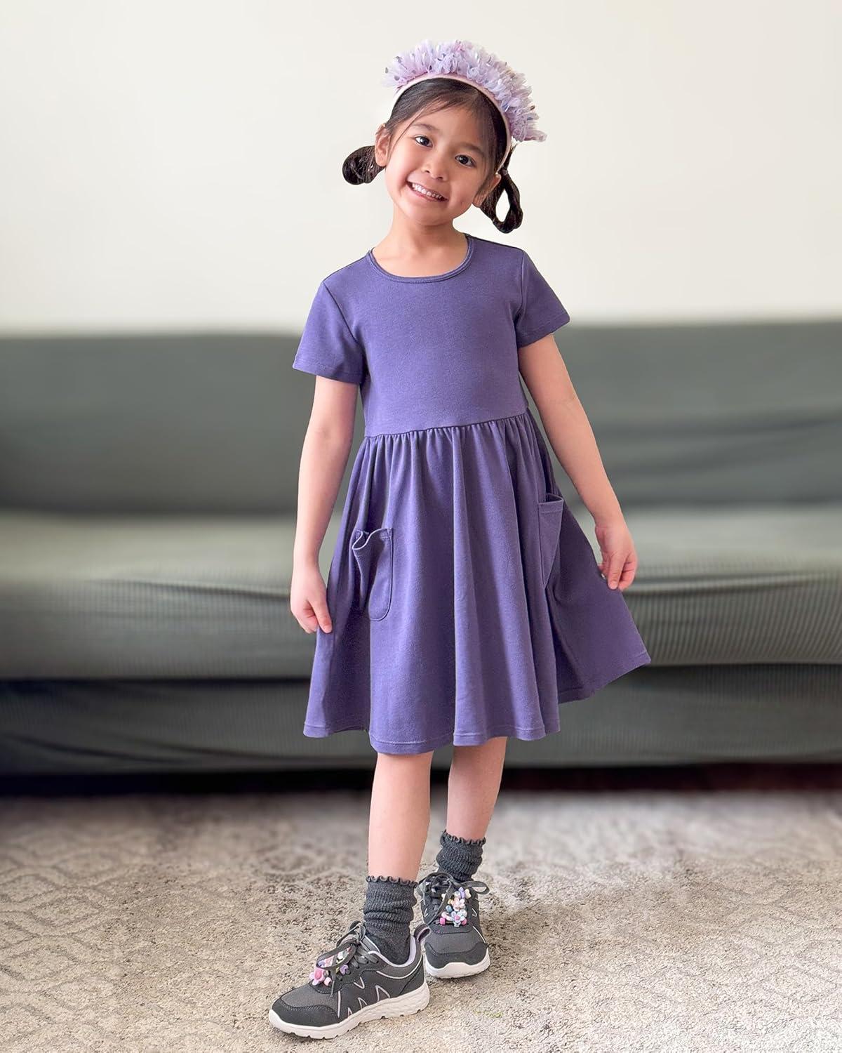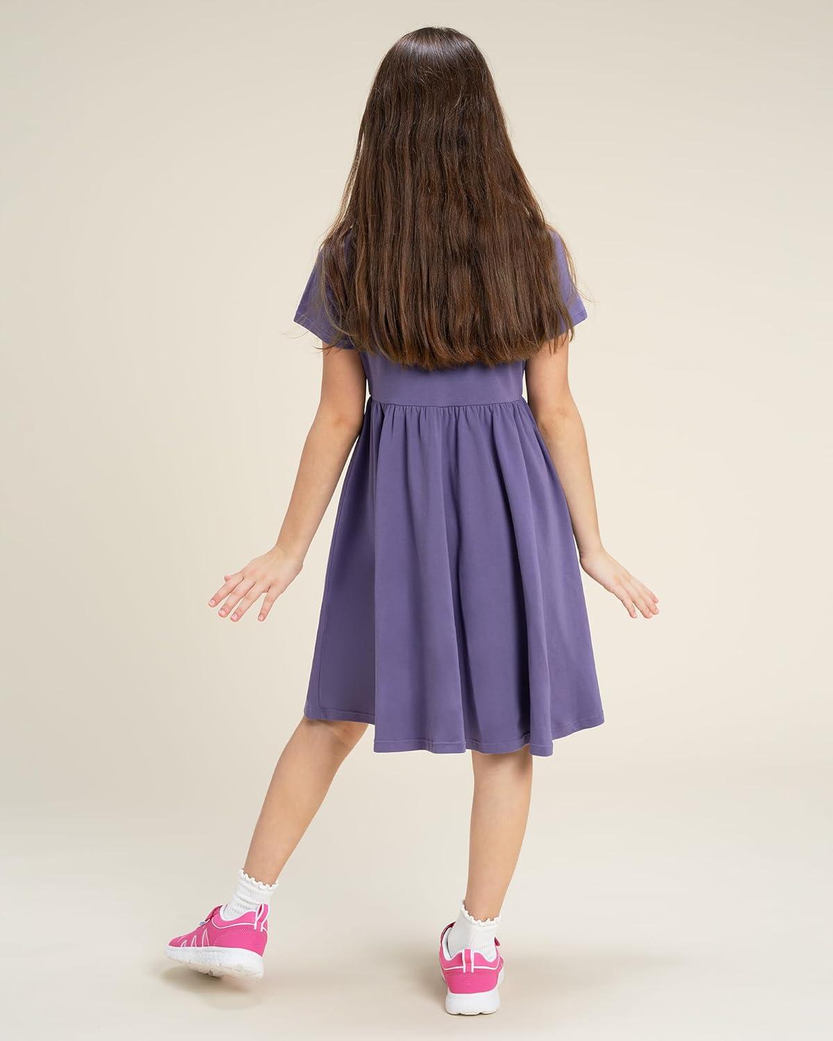 Stelle Girls Short Sleeve Dress Summer Kids Toddler Skater Twirl A Line Solid Color T-Shirt Dress for School Casual 3-12 Y(Dusty Grape)
