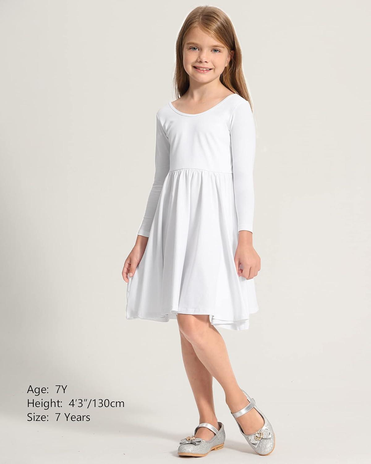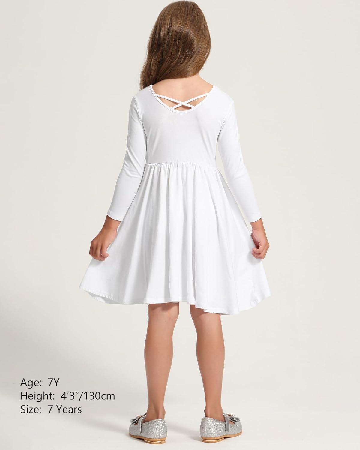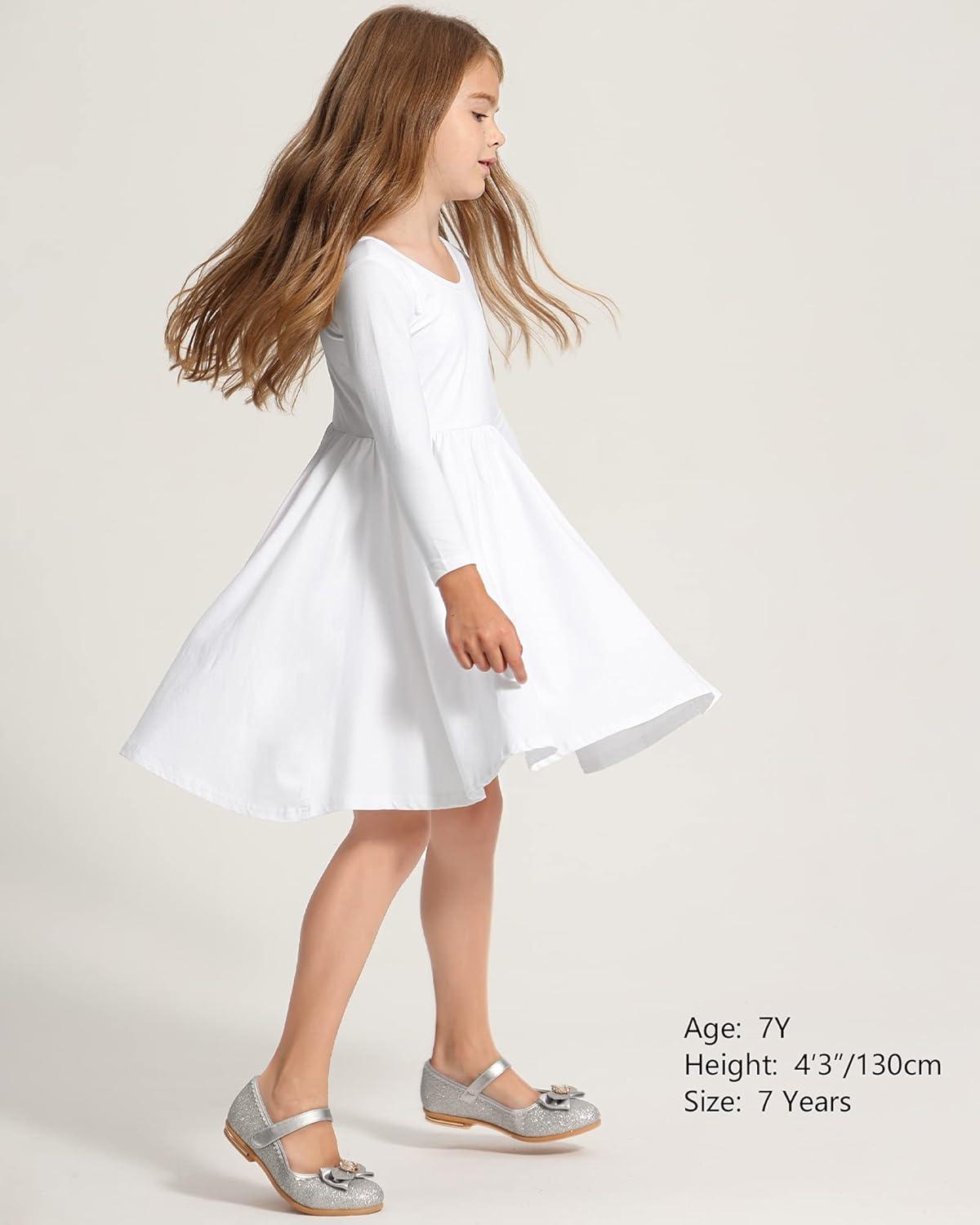Stelle Long Sleeve Girls Dress Toddler White Dresses Skater Twirl Cotton A-Line Dress for School Casual(White)