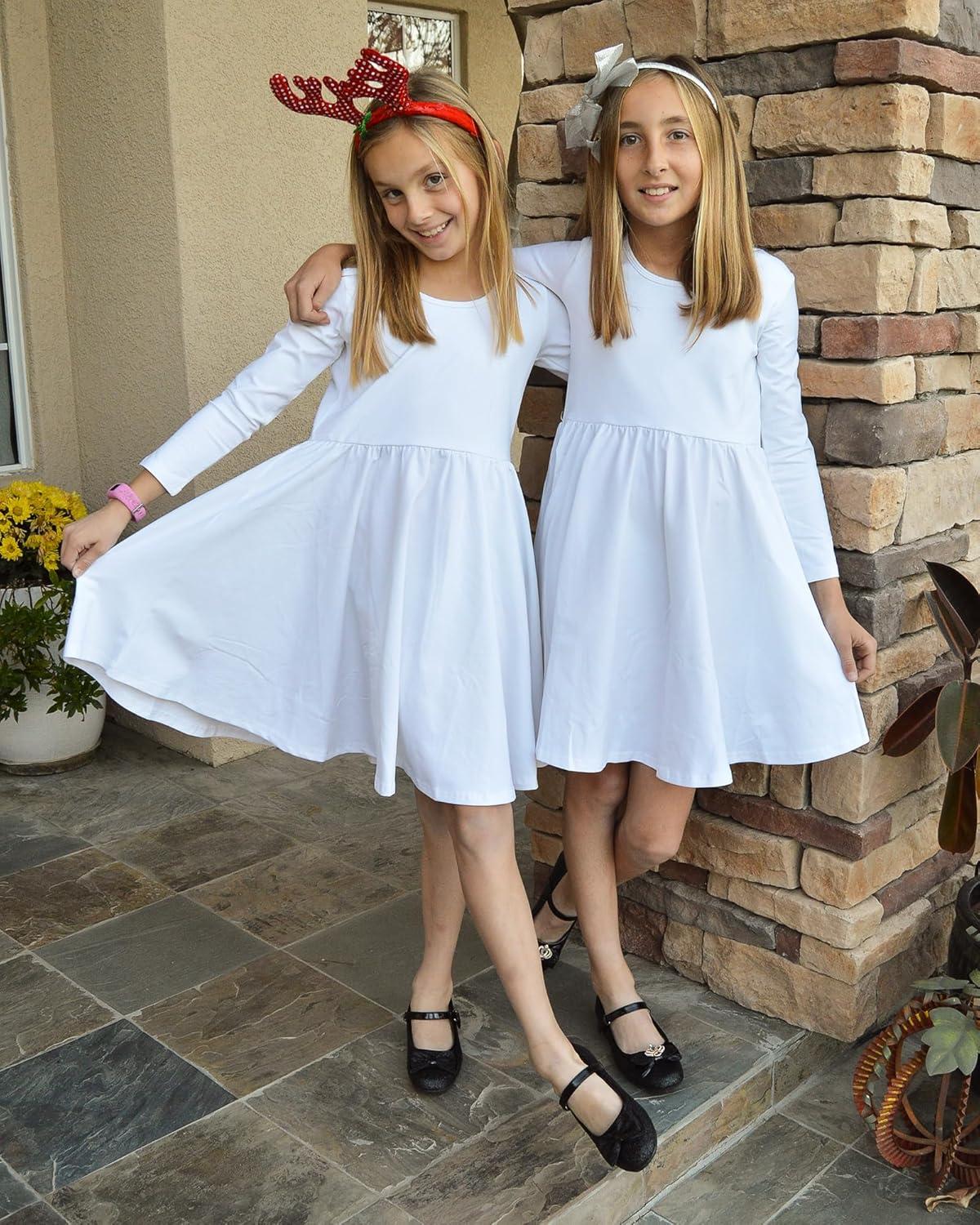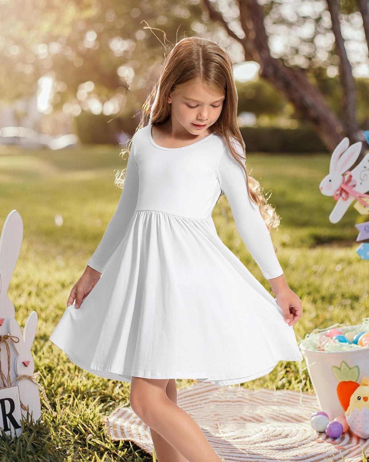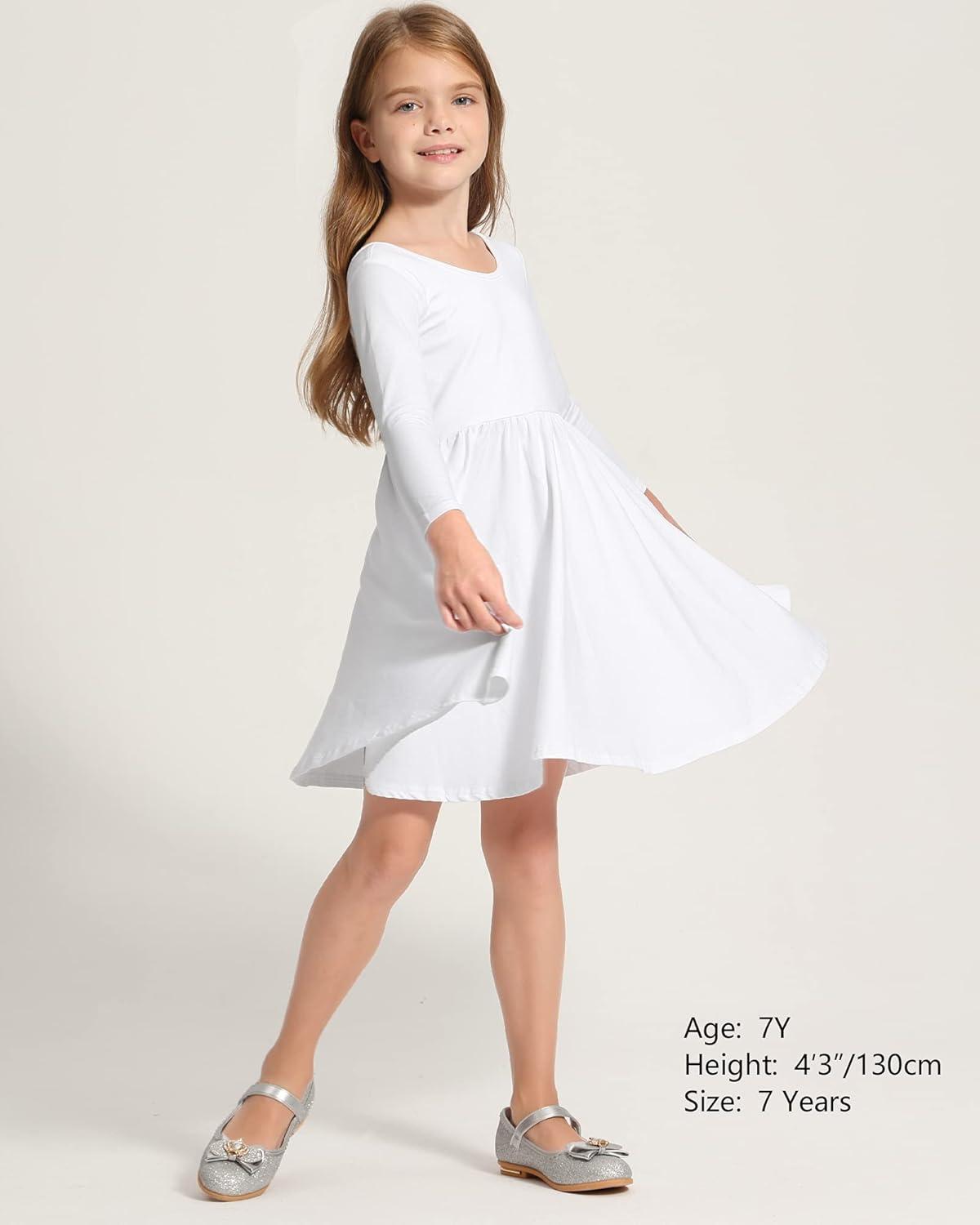 Stelle Long Sleeve Girls Dress Toddler White Dresses Skater Twirl Cotton A-Line Dress for School Casual(White)