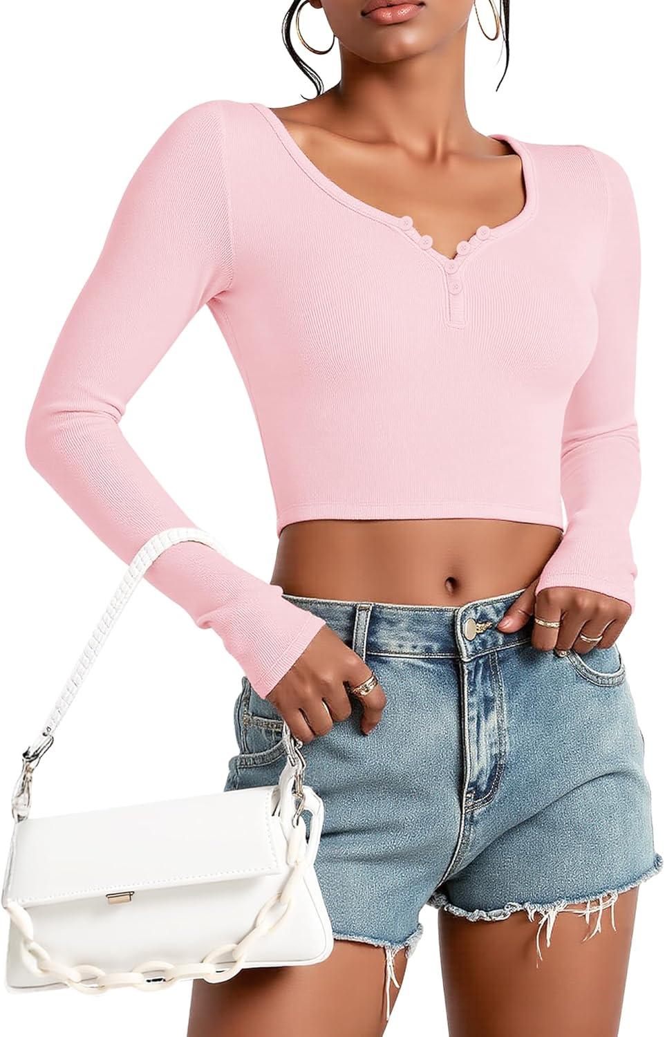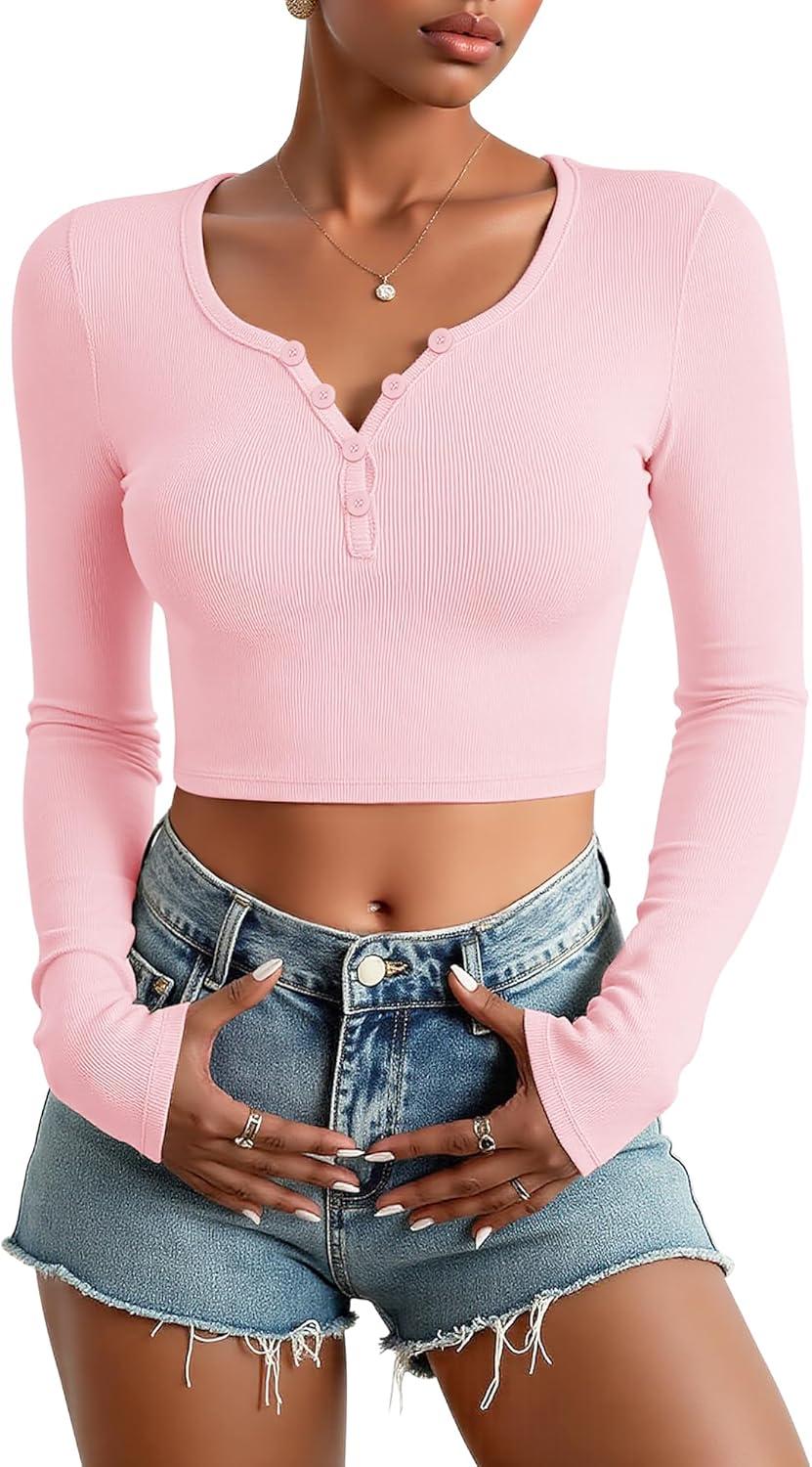 Stelle Women Henley Long Sleeve Crop Tops Ribbed Knit Button Slim Fitted Tops Casual Basic T Shirts(Cherry Blossom)