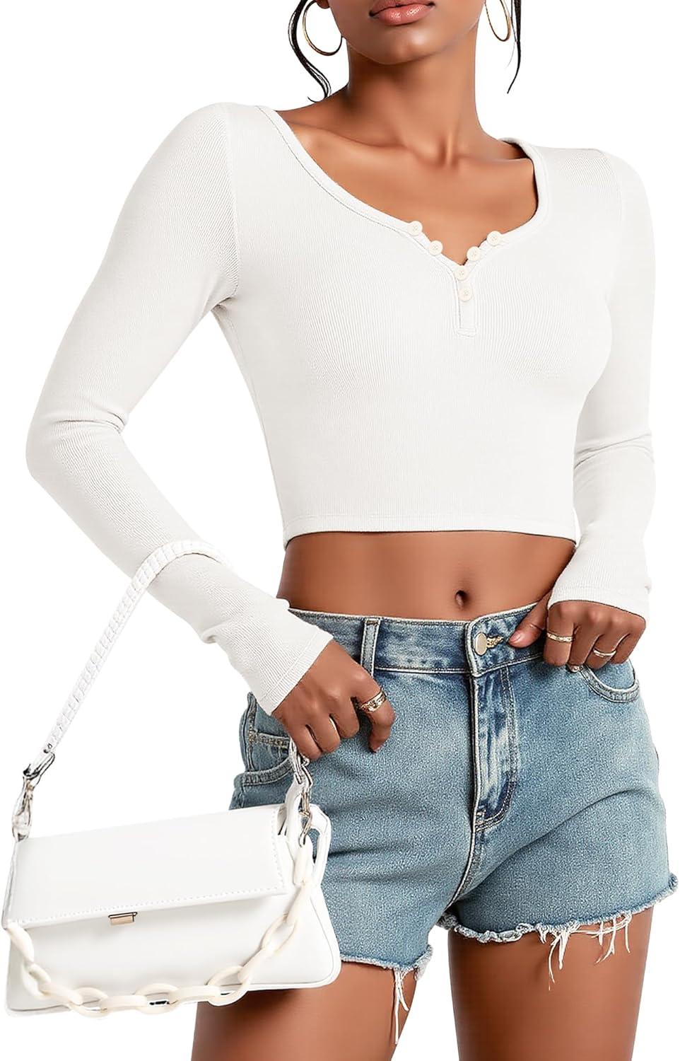 Stelle Women Henley Long Sleeve Crop Tops Ribbed Knit Button Slim Fitted Tops Casual Basic T Shirts(Ivory)