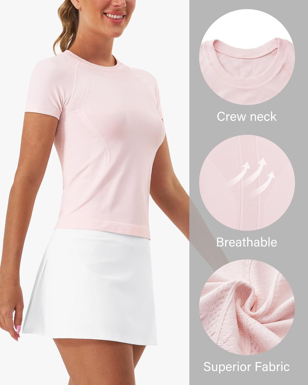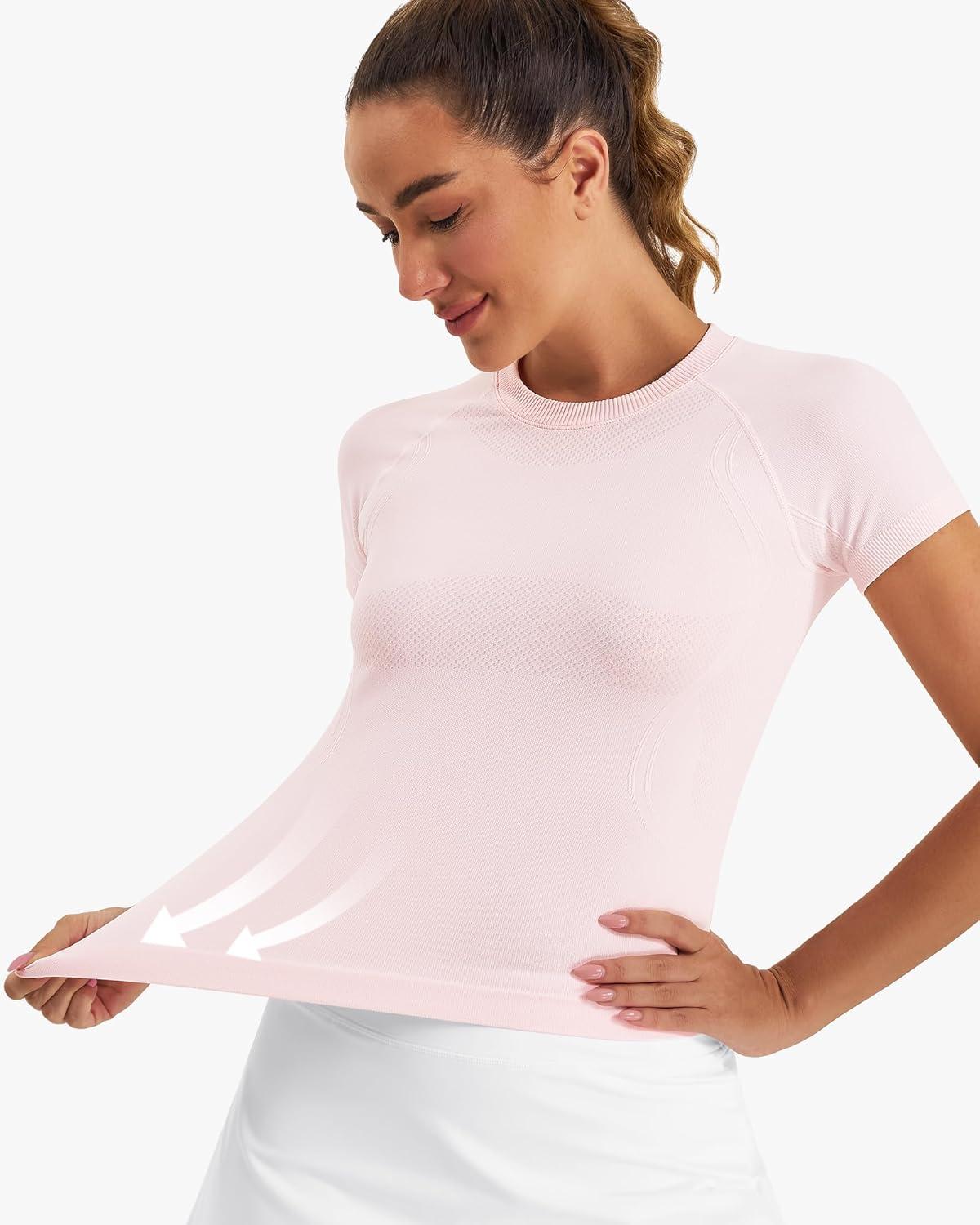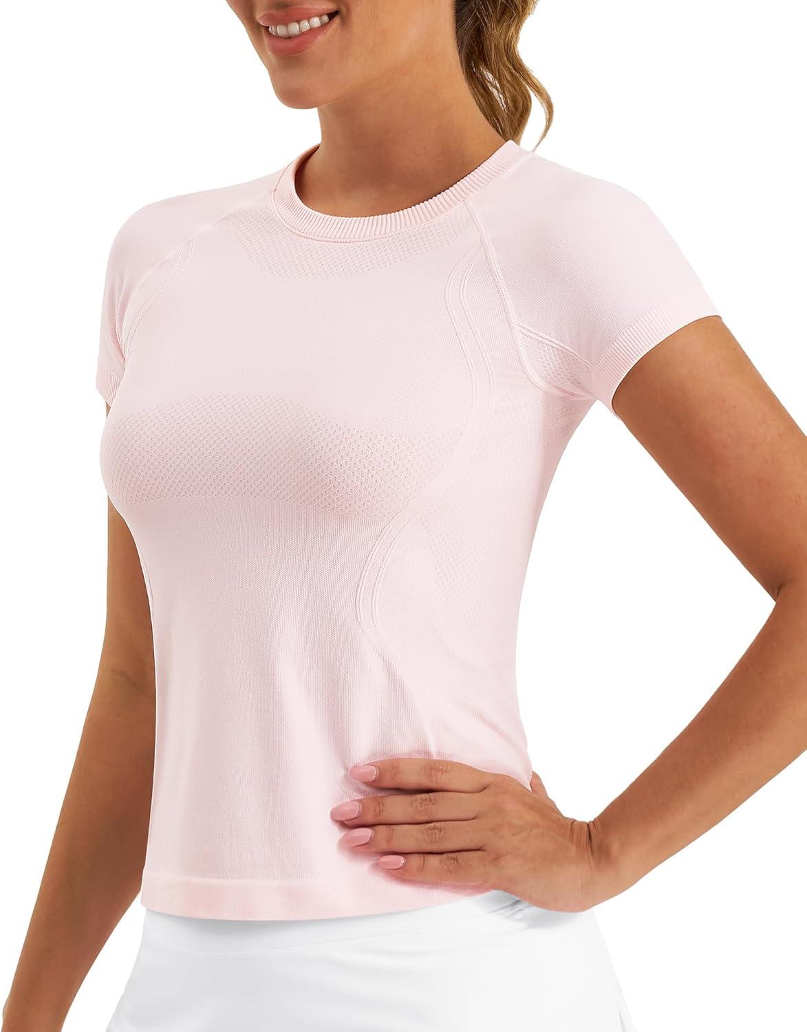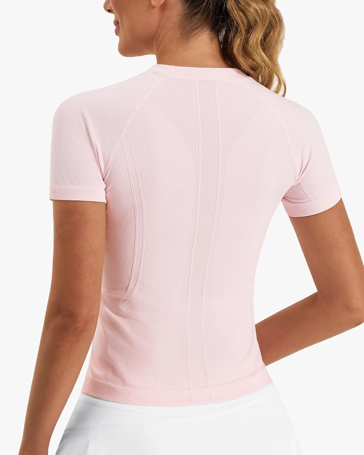 Stelle Women Workout Tops Short Sleeve Seamless Athletic Shirts Yoga Gym Sports Breathable Tees(Short Sleeve-ballet Pink)
