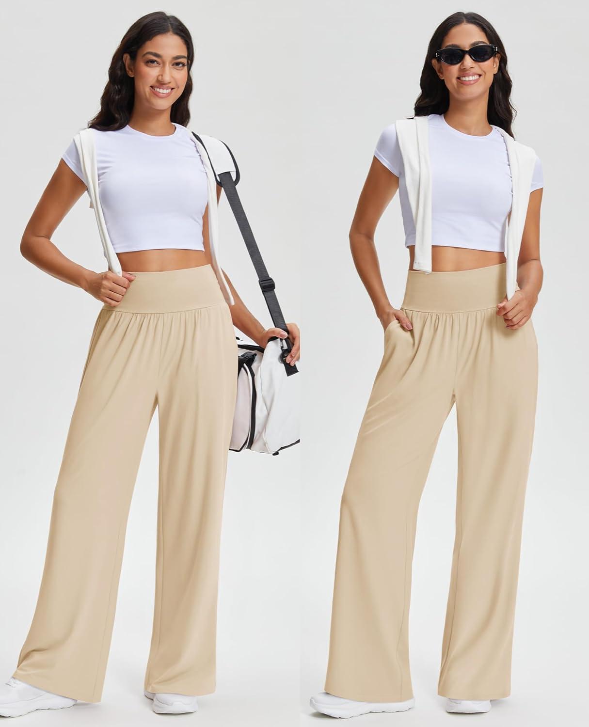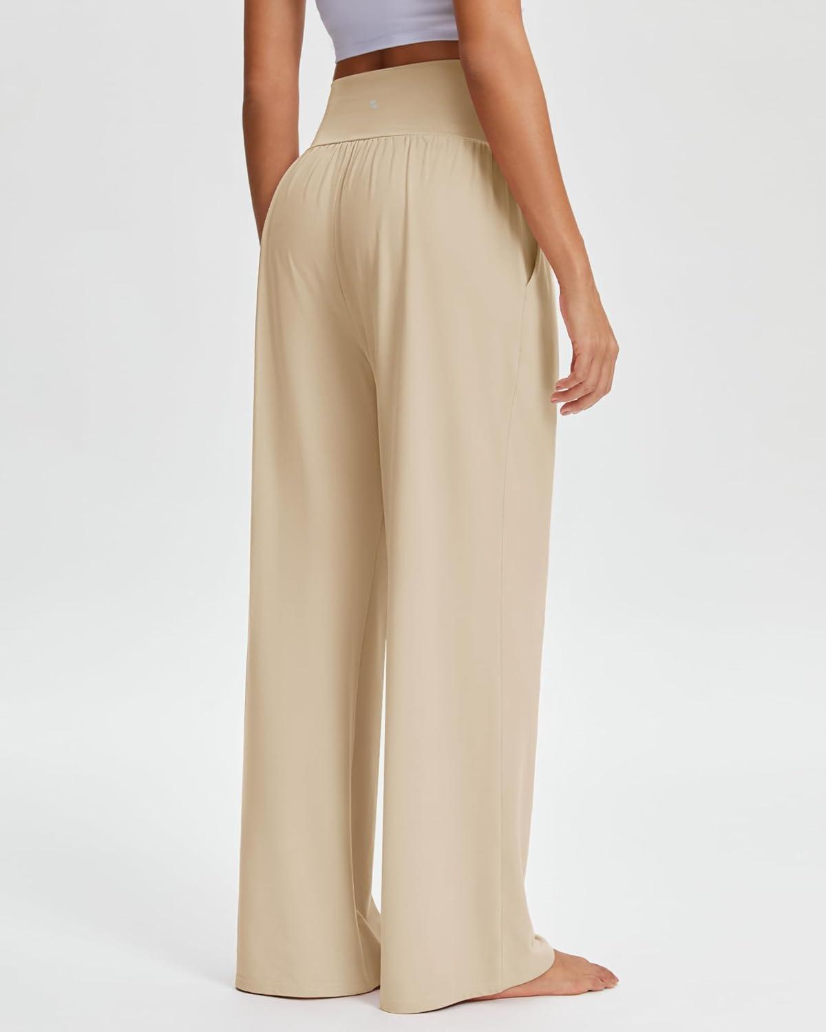 Stelle Women’s Wide Leg Yoga Pants Soft High Waisted Sweatpants Stretch Lounge Bottom with Pockets 28″ Inseam(Beige)